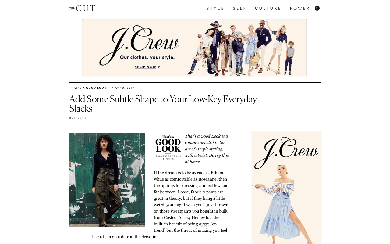 eCommerce is a big opportunity for media and retail brands to capitalize on the convergence of content and commerce. To leverage the trend, we created a new discovery platform from The Cut featuring impressive women with impressive style. While each product featured was independently selected, we guaranteed select brands items from their current collection would be featured with stoppable links back to their preferred commerce platform. We then styled and shot our subjects and promoted it in a series called That’s A Good Look, devoted to the art of simple styling, with a twist.